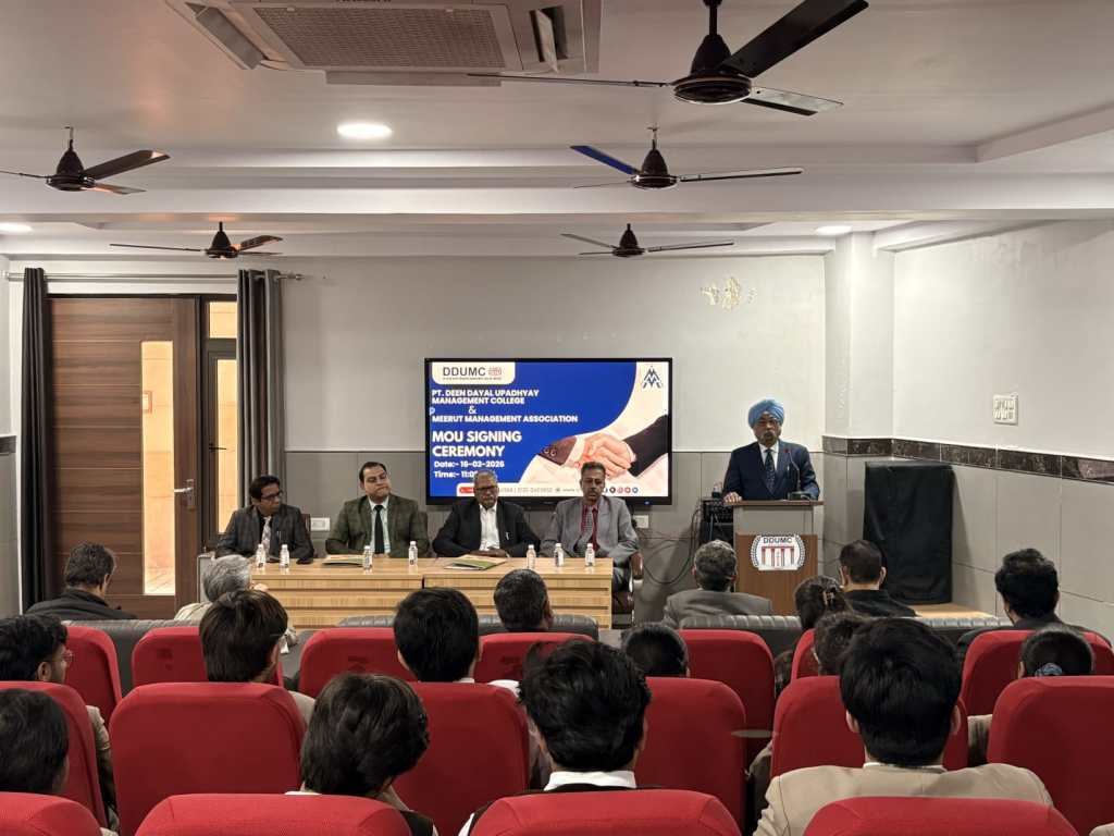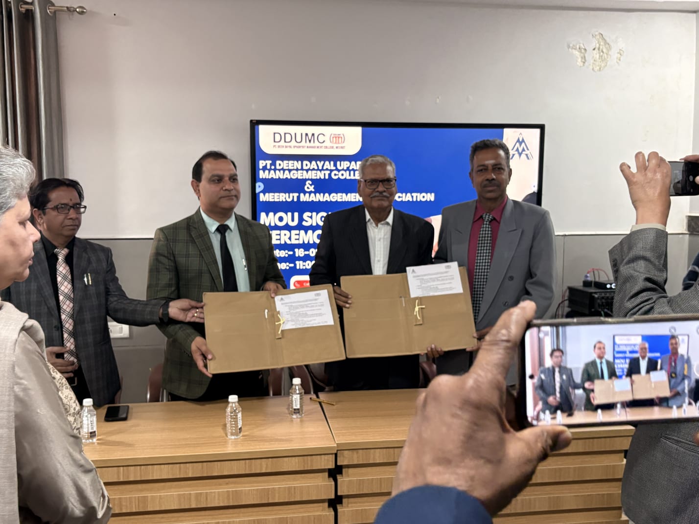 On 16th February 2026, the Meerut Management Association (MMA) signed a Memorandum of Understanding with Pt. Deendayal Upadhyay Management College, Meerut, expanding its Student Chapter initiative to the sixth institute. The MoU was signed by Mr. S. P. Singh, President, MMA, and Mr. S. Ravichandran, Chairman – Student Chapter, MMA. Dr. Nirdesh Vashishtha, Director, and Dr. Robins Rastogi, HOD – Management Studies, represented the institute. Over 20 students and three faculty members joined MMA on the occasion. The MMA delegation included Mr. Anurag Agarwal, Vice President; Mr. Ankur Jaggi, Immediate Past President; Ms. Madhu Dang, Council Member; and Mr. Sukhvinder Singh. The interactive session strengthened industry–academia collaboration and financial awareness.
