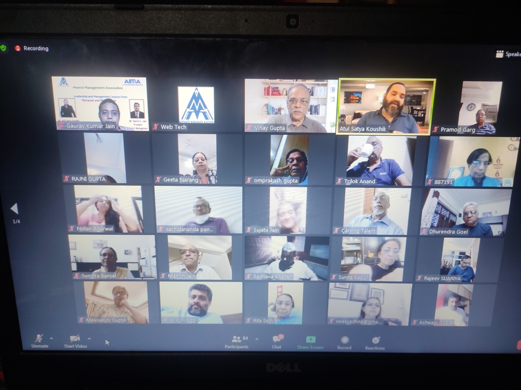 A webinar was organized by Meerut Management Association on 5th September 2020 via Zoom. Theme of this webinar was Leadership and Management Lessons from Ramayan and Mahabharat. The eminent speaker was Mr. Atul Satya Koushik, Famous Playwriter, Director, Producer, Promoter and Motivational Speaker. Mr. Gaurav Jain, President, MMA was the moderator of the webinar. Members exchanged questions and additional inputs as a part of knowledge sharing session. The webinar was widely appreciated by all attendees.