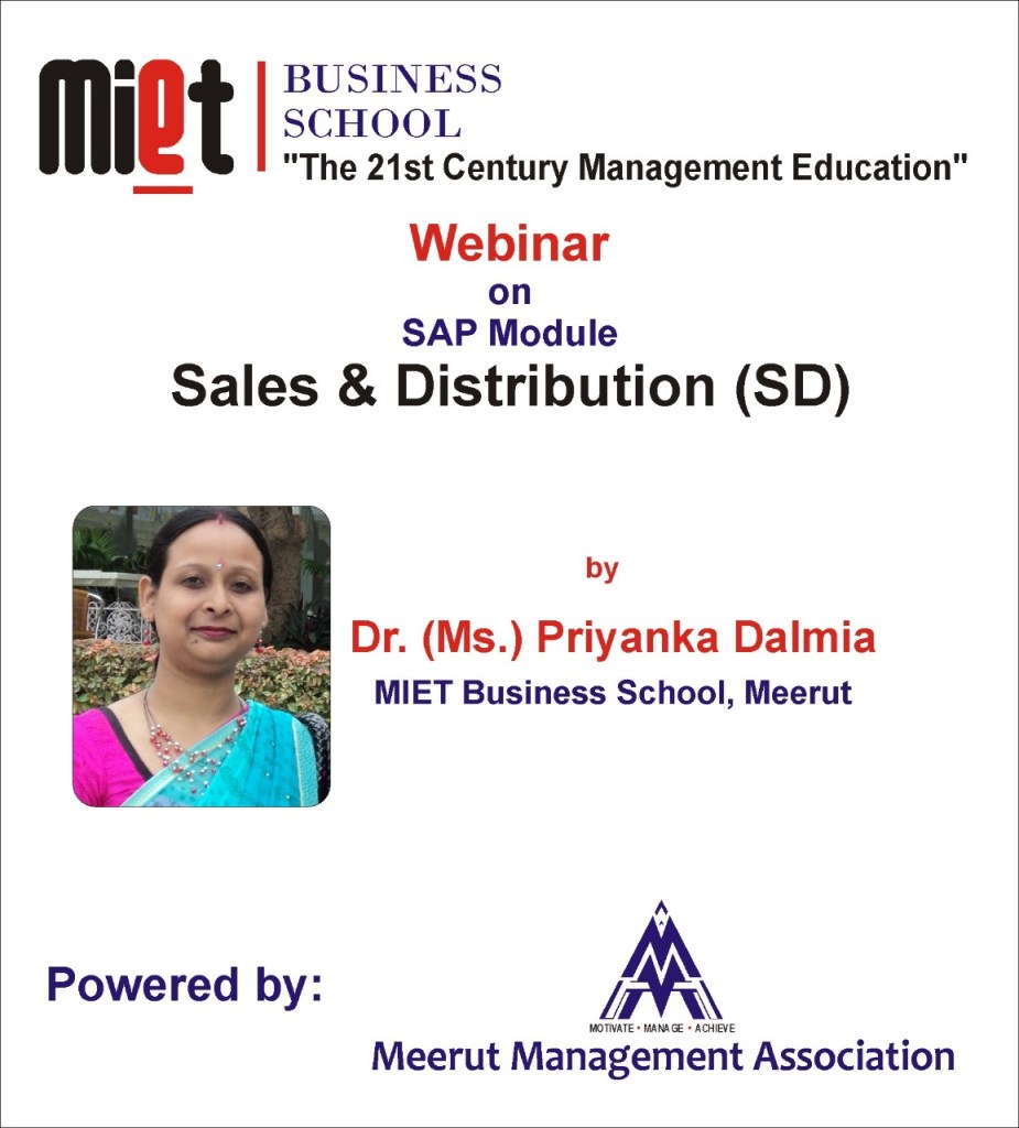44 Days Program on SAP (Systems, Applications & Products) (12 October 2020) On October 12, 2020November 7, 2020 By KapilGIn Update A 44 days program on SAP is being organized by Meerut Management Association in association with MIET Business School via Google Meet. The distinguished trainer is Dr. (Ms.) Priyanka Dalmia, MIET Business School. Share this: Click to share on X (Opens in new window) X Click to share on Facebook (Opens in new window) Facebook Like Loading... Related