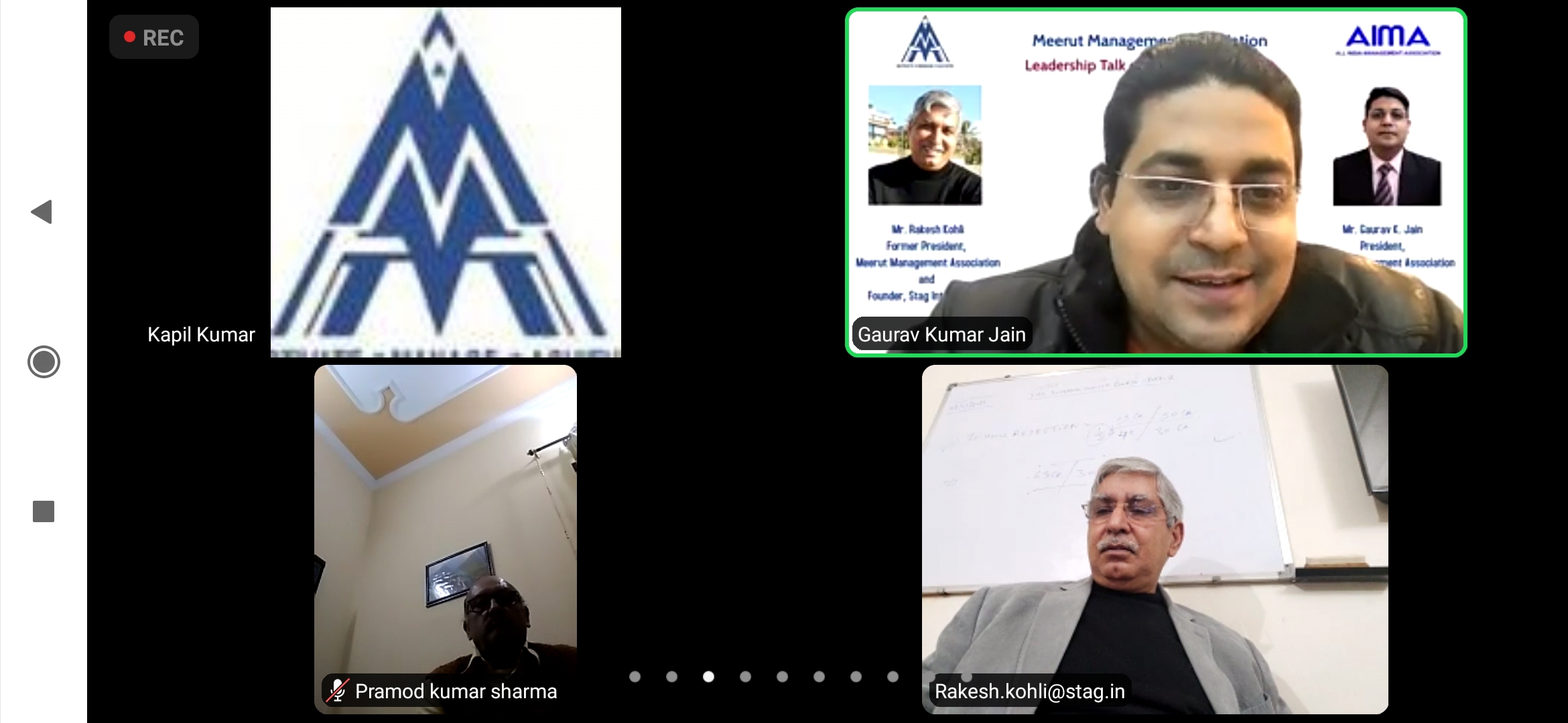 A webinar was organized by Meerut Management Association on 09th January 2021 via Zoom. Theme of this webinar was Second Leadership Talk on Struggle & Success. The eminent speaker was Mr. Rakesh Kohli, Founder, Stag International. Mr. Gaurav Jain, President, MMA was moderator of the webinar. Members and Students exchanged questions and additional inputs as a part of knowledge sharing session. The webinar was widely appreciated by all attendees.