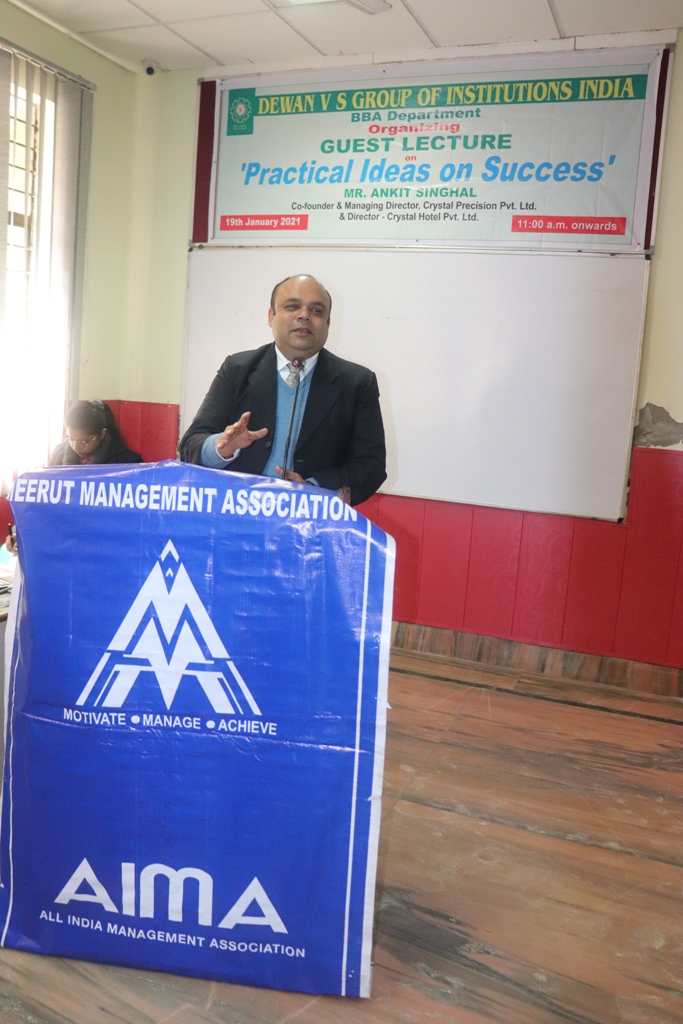 Meerut Management Association organized a Student Mentorship program in association with Dewan VS Group of Institutions, Meerut on Practical Ideas on Success at Dewan VS Group of Institutions, Meerut on 19th January, 2021. Mr. Ankit Singhal, Former President, Meerut Management Association was the distinguished speaker. Mr. Gaurav Jain, President MMA, Mr. Kapil Gahlot, Executive Director, MMA, Students and Faculties of Dewan VS Group of Institutions, Meerut and Members of MMA were also present at the Event.