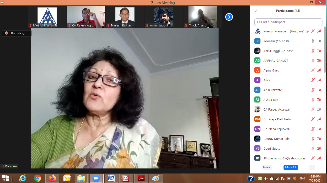 Meerut Management Association organized a webinar on Social Support in Covid Time on 07th May, 2021 via Zoom. The distinguished speaker was Dr. Poonam Devdutt, Former President, MMA. Col. Naresh Goyal, Former President, MMA welcomed Dr. Poonam. Mr. Ankur Jaggi, Former President MMA was the moderator. The question-answer session was conducted by Capt. V. K. Gupta, Former President, MMA and vote of thanks was presented by Mr. Ashok Jain, Former President, MMA. Members and guests exchanged questions and additional inputs as a part of knowledge sharing session. The webinar was widely appreciated by all attendees.