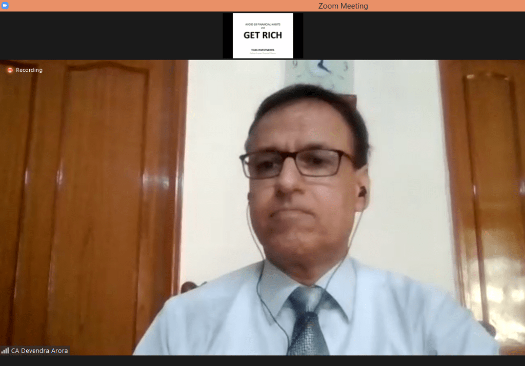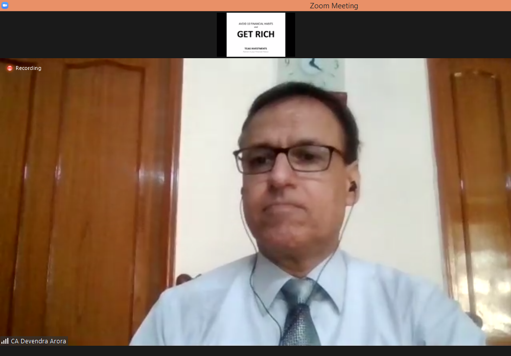 A webinar was organized by Meerut Management Association on 31st July, 2021 via Zoom. Theme of this webinar was Avoid 10 Financial Habits To Get Rich. The eminent speaker was CA Devendra Arora, Senior Chartered Accountant. Mr. Gaurav Jain, President, MMA was moderator of the webinar. MMA Members, guests and students exchanged questions and additional inputs as a part of knowledge sharing session. The webinar was widely appreciated by all attendees.