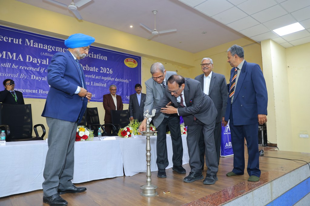 Chief Guest Col. (Dr.) Naresh Goyal along with Mr. Rajesh Agarwal, Senior Vice President, Dayal Group, lighting the ceremonial lamp to inaugurate the 25th MMA Dayal Annual Debate – 2026.